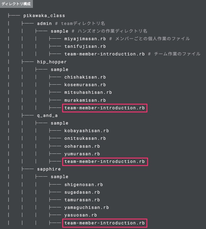 ※ team-member-introduction.rbに名前を記述する際には、前の担当者のコードを削除せずに、次の行に記述するよう気をつけてください。