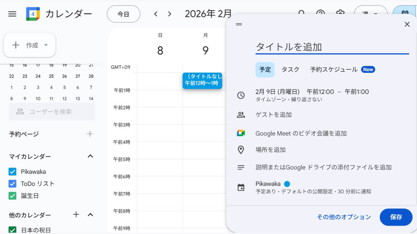 Googleカレンダー連携の動作確認を行うため、事前にGoogleカレンダーへ来週の予定を登録しておきます。テスト用の予定で問題ないため、日時とタイトルが分かる簡単な内容を1件以上追加してください。