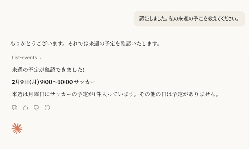 この手順が完了すれば、Claude Desktop から Google カレンダーの予定を取得したり、予定の確認や整理といった操作が可能になります。