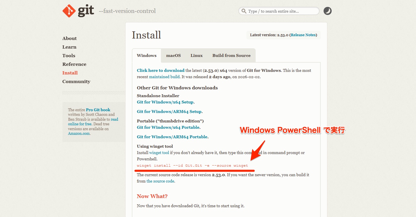 上記のコマンドでGitをインストールしたら、Windows PowerShellを再起動しておきましょう。