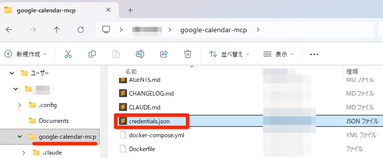 Google カレンダーの設定時にダウンロードしたcredentials.jsonファイルを「google-calendar-mcp」フォルダに移動します。