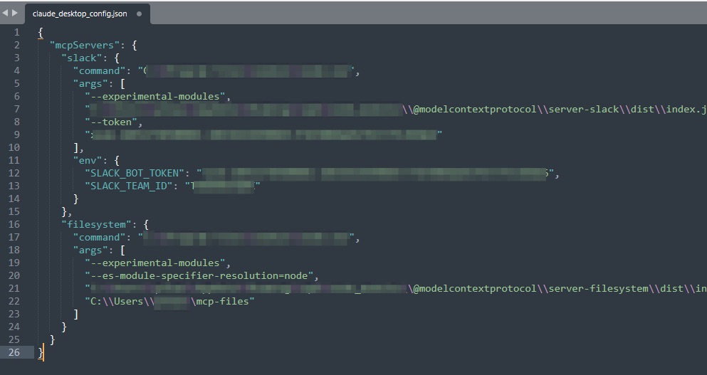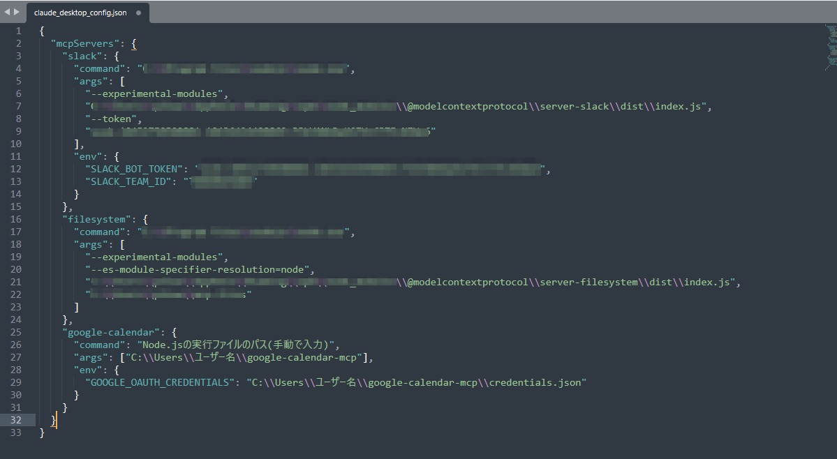 claude_desktop_config.jsonでは、以下のように前回設定したSlack、ファイルシステム用の設定がすでに記述されています。