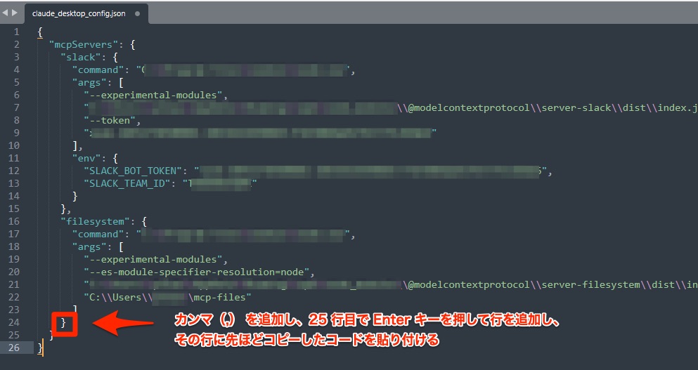 コードを貼り付けると、claude_desktop_config.jsonは最終的に以下のような内容になります。