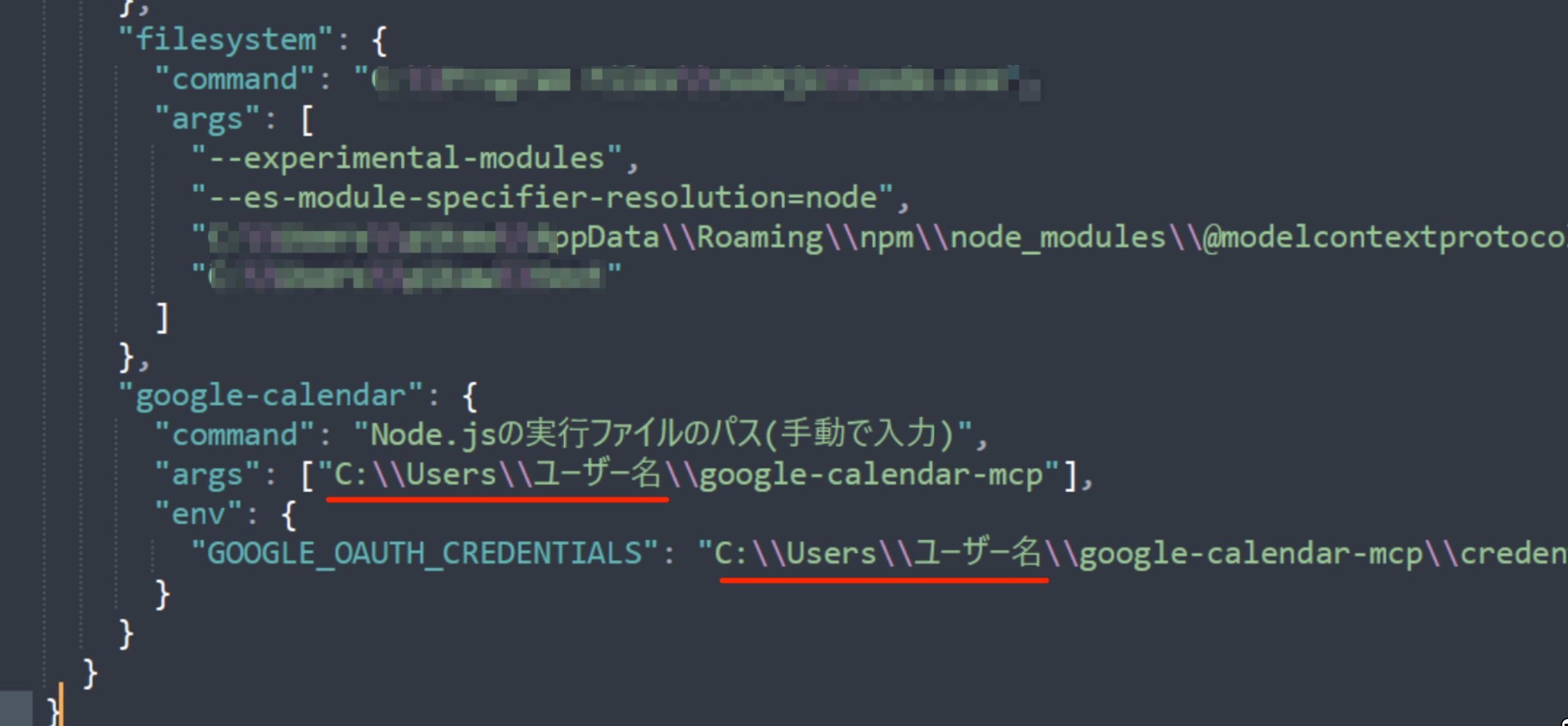 "args": ["C:\\Users\\ユーザー名\\google-calendar-mcp"],