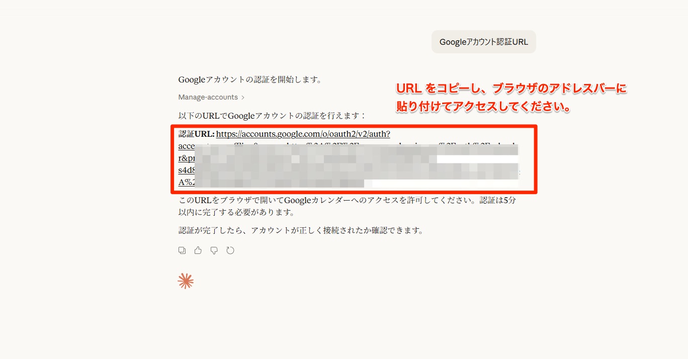 ここでは、Claude Desktop から Google カレンダーにアクセスするために、Google アカウント(カレンダーを操作したいアカウント)との連携を行います。この認証は、初回のみ必要 です。