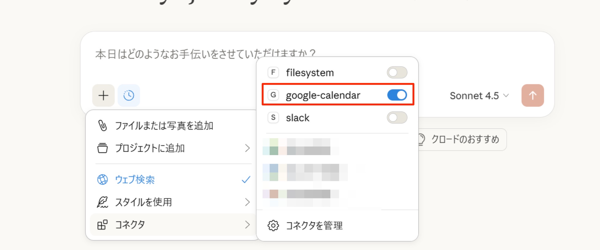 起動後、新しいチャットの画面になっていることを確認し、入力欄の「+」ボタンをクリックし、表示されたメニューから [コネクタ] を選択し、google-calendar をオンにしましょう。