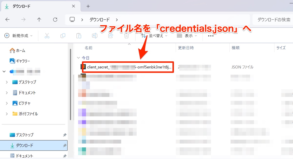 ダウンロードしたファイルの名前を「credentials.json」に変更してください。