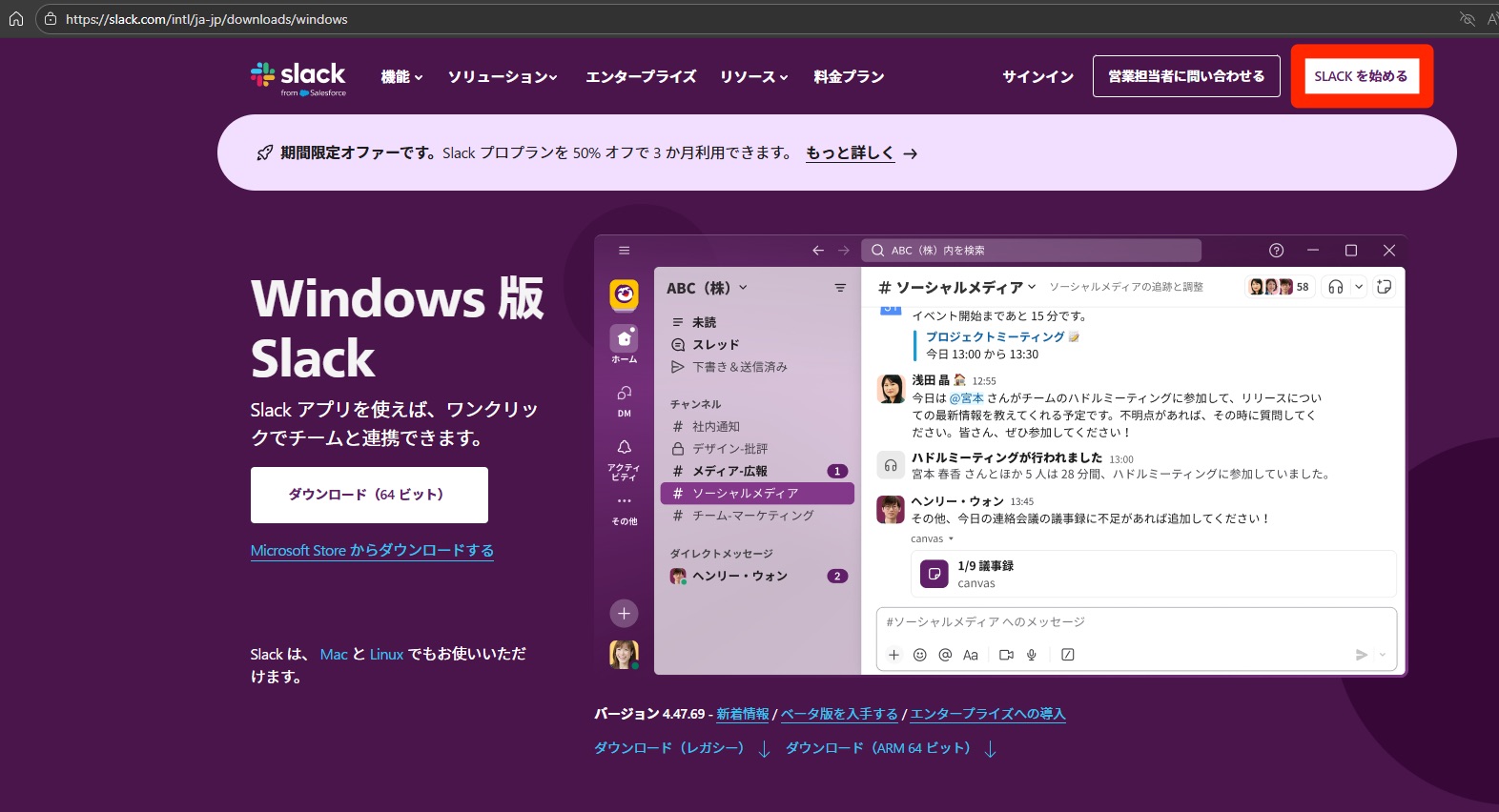 こちらのページを開いて「Slackを始める」をクリックしましょう。