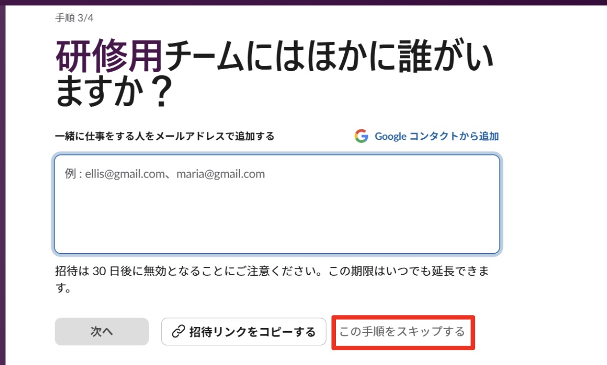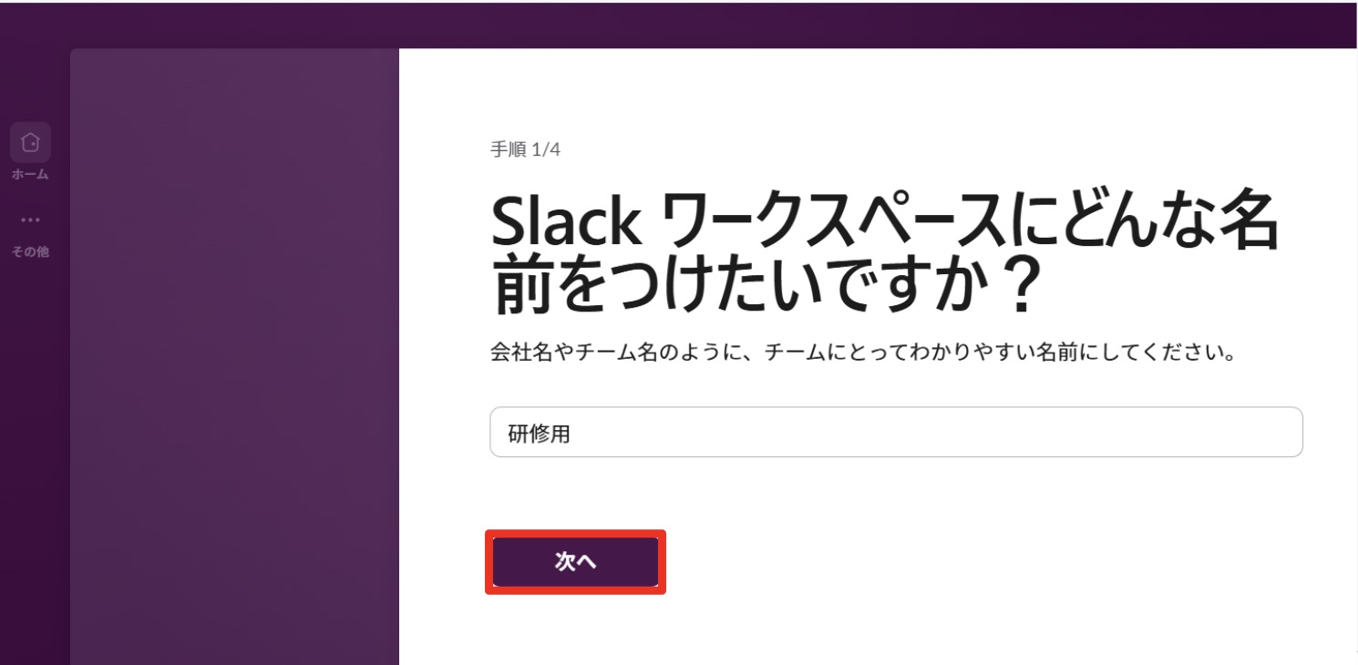 ※ワークスペースの名前は、「研修用」でなくても問題ありません。