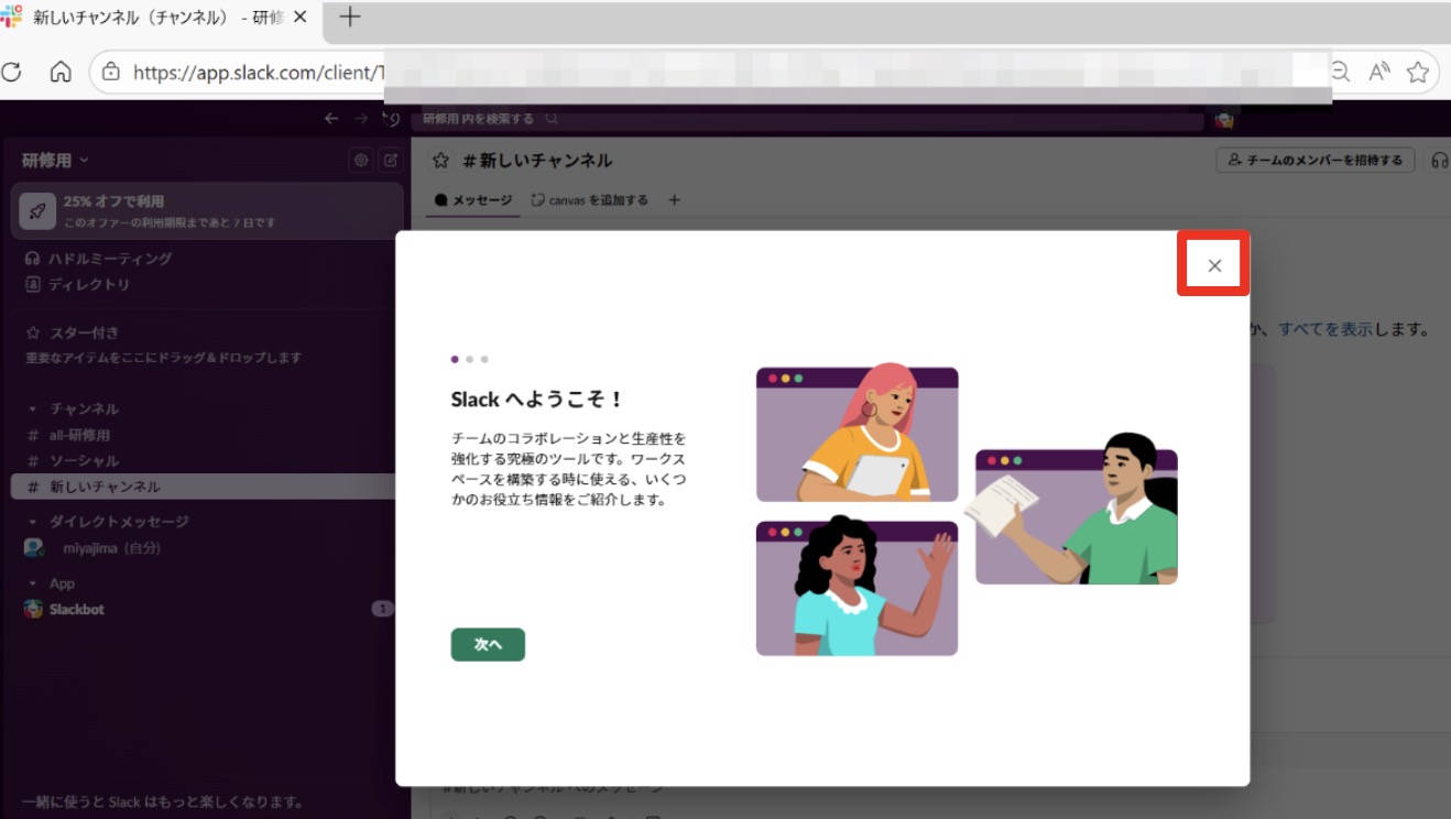 Web版のSlackが開かれます。モーダル右上の「x」をクリックしましょう
